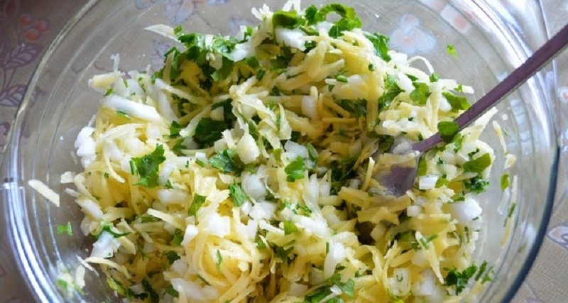 Cebule obierz ze skóry, natkę pietruszki opłucz, oba te składniki drobno posiekaj. W misce umieść użyte pokrojone warzywa i połącz je razem mieszając.