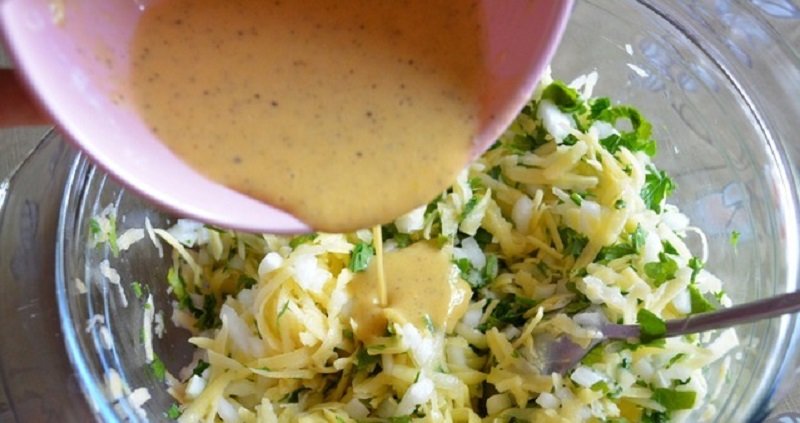 Do następnej miski wrzuć jajko, białko, mąkę i przyprawy jak sól i pieprz (możesz wzbogacić smak, dodając inne aromatyczne przyprawy, które lubisz). Składniki starannie wymieszaj. Zawartość przelej do miski z warzywami, łącząc wszystkie składniki.