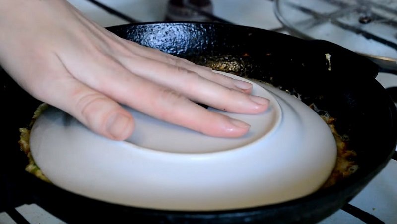 Patelnie przykryj pokrywką i smaż 15 minut na małym ogniu do uzyskania złotego koloru. Kolejno przekręć placek, używając łopatki lub talerza na drugą stronę.