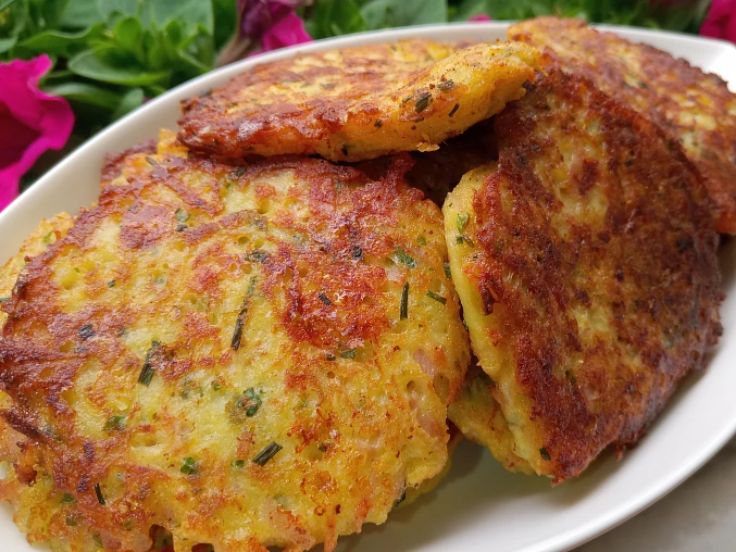 Ziemniaki zetrzeć na grubej tarce do miski, dodać drobno posiekaną cebulę, następnie dodać drobno posiekaną szynkę i grubo starty ser. Następnie dodać jajka, mąkę i posiekane zioła, na koniec dodać sól i pieprz i wszystko wymieszać.
